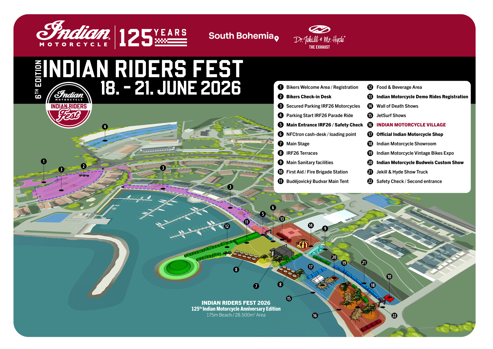 Für maximale Sicherheit empfehlen wir allen Fahrern, ihre Indian Motorcycles auf Parkplatz Nr. 3 (hellviolett) abzustellen, der rund um die Uhr bewacht wird.